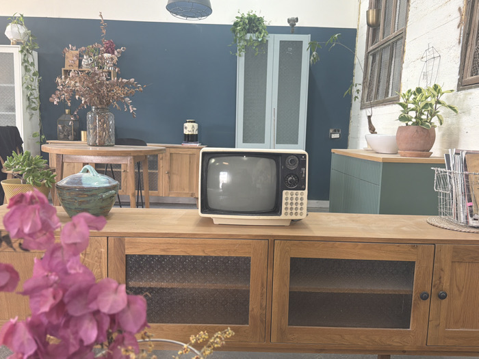 An old television sits atop a wooden cabinet with glass-paneled doors. Behind, a round table holds a large vase with dried flowers. A blue-green cabinet stands against a dark blue wall, while another green cabinet is on the right, next to a white wall with framed windows. Plants are placed throughout the scene, and purple flowers fill the foreground, adding depth to the composition.
