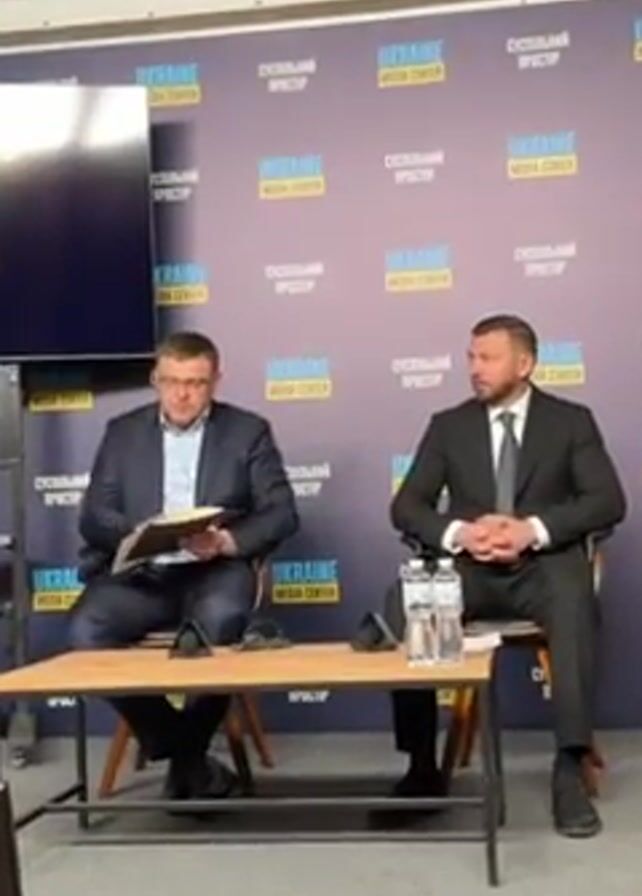 two men sitting at a table in front of a backdrop with a pattern of the "Ukraine Media Center" logo. The man on the left is wearing glasses and a dark suit and is looking at a document in his hands. The man on the right is also wearing a dark suit and tie and is looking straight ahead. There are two bottles of water and a book on the table between them. The table is a light-colored wood, and the legs are black. The backdrop is primarily white and purple. A monitor is visible to the left.