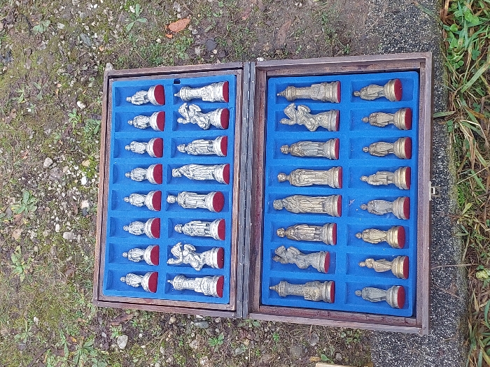An open, rectangular wooden box containing two sets of sculpted chess pieces is depicted from an overhead perspective, resting on the ground in Eckbolsheim, France