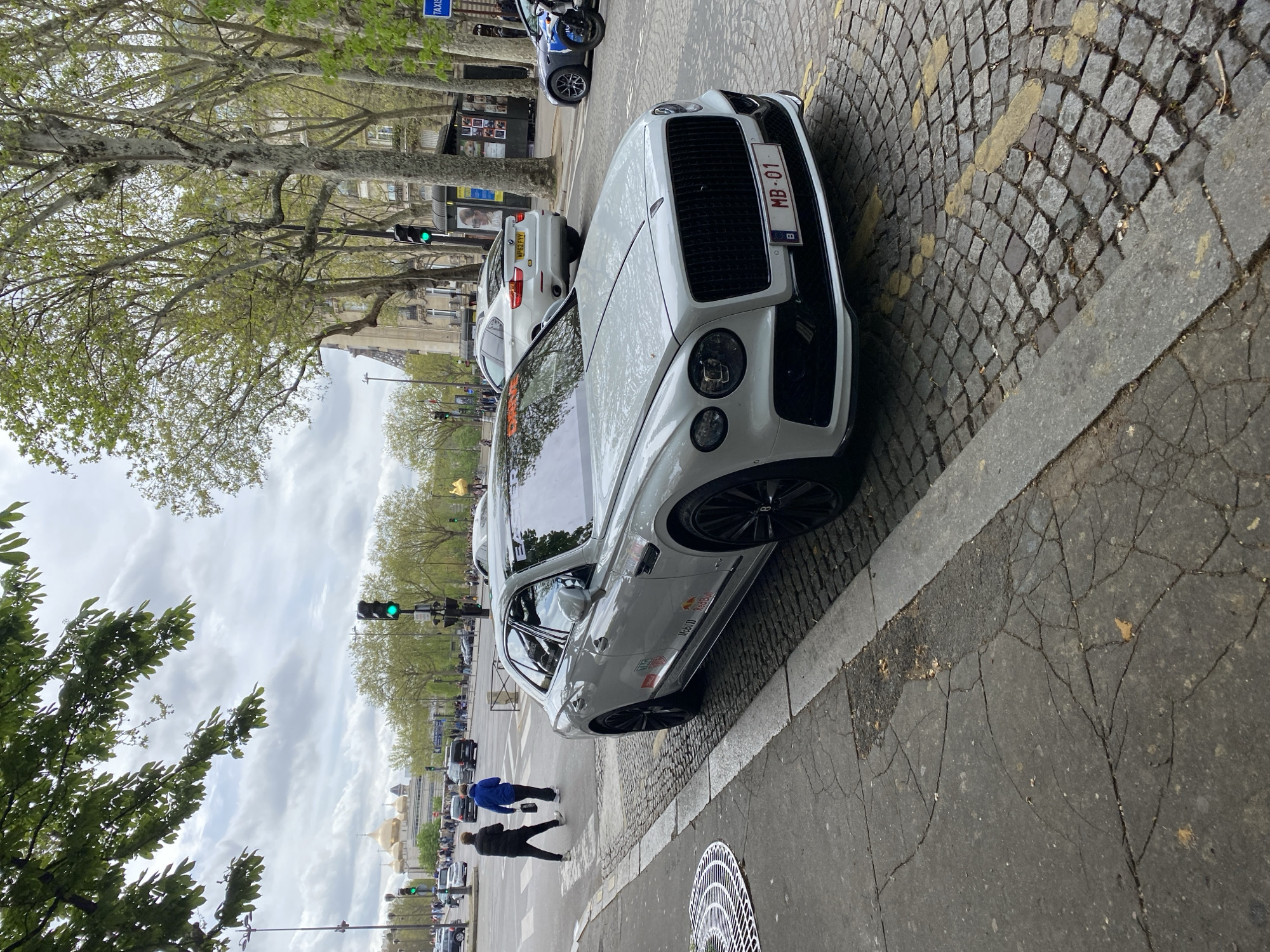 street scene in Paris, France. A white Bentley car with the license plate "MB-01" is parked on a cobblestone street next to a sidewalk. The Eiffel Tower is visible in the background between trees. Several people are walking on the crosswalk. There are other cars and motorcycles on the road. Traffic lights are visible, showing green. The weather appears overcast.