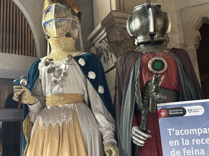 Two large figures stand side-by-side. The figure on the left wears a blue and white gown with a golden sash, a cape lined with seashells, and a mosaic-patterned headpiece. The figure on the right is clad in a reddish-brown robe and a metal head covering resembling a helmet. A dragon-headed staff is in its hand. A sign bearing the Barcelona city council logo is beside the second figure. The figures are located indoors.