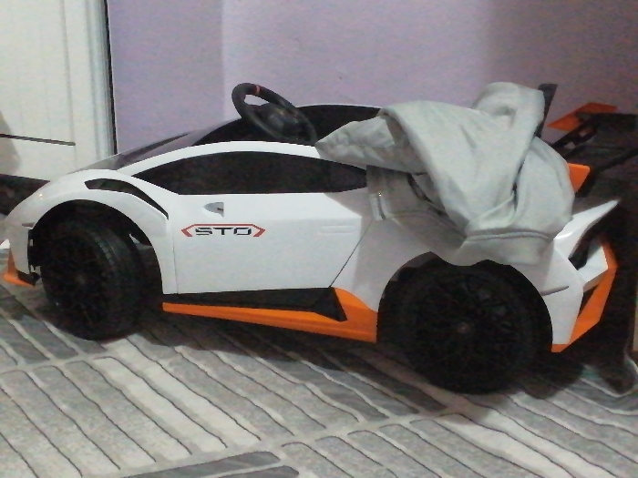 The scene is an indoor environment in the city of Sredets, Bulgaria. A white and orange ride-on toy car, resembling a sports car with "STO" branding in red on its side, occupies the central and right portions of the frame. The car features black wheels, a black steering wheel visible on the left side, and an orange front splitter and side skirts. A light grey long-sleeved garment, possibly a sweatshirt or jacket, is crumpled and draped over the rear section of the toy car. The car rests on a floor covered by a rug or mat with a pattern of alternating light and dark grey horizontal stripes. In the background, a plain light purple wall is visible, with a white vertical door frame or panel positioned on the far left. No individuals are present.