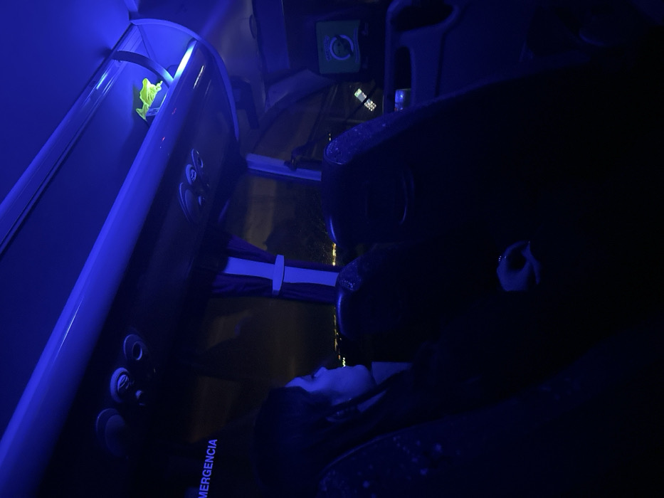 - "interior of a bus lit by blue overhead lights" by FM-WnqD53, licensed under CC BY 4.0