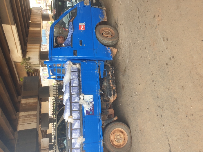 The image captures a blue pickup truck stationary on a dirt road underneath a concrete flyover in Nkpor, Nigeria