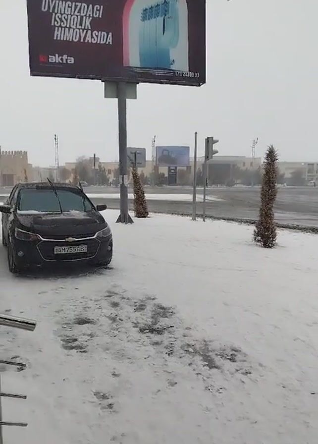 snowy street scene in what appears to be an urban area. A black car is parked on the side of the road, covered in snow. There is a large billboard above the car, displaying an advertisement in a language other than English. The street is covered in snow, and there are some trees and traffic lights visible. Cars are driving on the snowy road. The sky is overcast and gray.