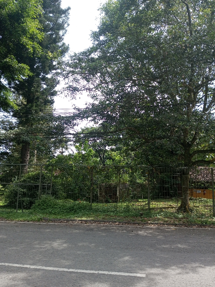 The image depicts an outdoor scene in Namthoung, Laos, characterized by dense vegetation and a paved road. In the foreground, a dark gray asphalt road with a single solid white line towards the bottom edge stretches horizontally across the frame. Shadows of overhead foliage are visible on the road surface. Immediately behind the road, a strip of ground is covered in green undergrowth and dry leaves. A dark metal fence, possibly chain-link or wire, extends horizontally across the midground, partially obscured by the ground vegetation and further dense greenery behind it. Two prominent trees anchor the background: a tall, slender coniferous tree with dark green foliage on the left, and a large, broadleaf tree with dense, lighter green foliage on the right. Both trees reach towards the top of the frame, partially framing a bright, overcast sky. Multiple dark utility cables run horizontally across the upper mid-section of the image, passing through the tree canopy. Behind the fence and trees on the far right, a portion of a building with a textured or thatched roof and a yellowish-brown wall is visible. No individuals or active subjects are present in the scene.