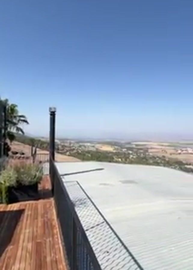 The camera pans from a wooden deck overlooking a valley to a large corrugated metal roof. In the distance, there is a body of water. The sky is clear and blue. A black metal fence borders the wooden deck. There are various potted plants on the deck. Beyond the deck is a small, enclosed structure and a white umbrella.