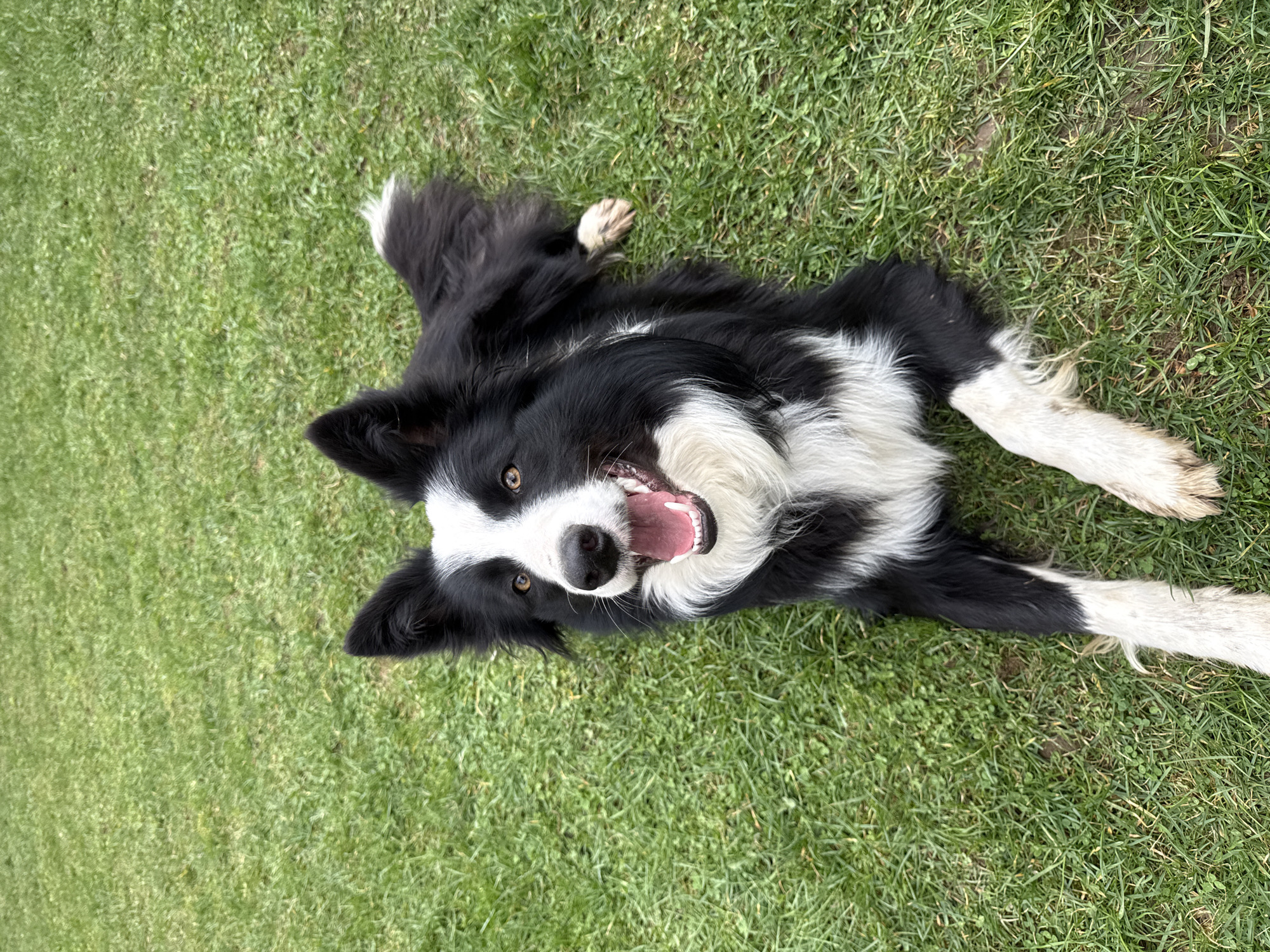- "A black and white Border Collie dog is depicted lying on its belly on a uniformly green grass surface in Berkovitsa, Bulgaria" by FM-Foz7E2, licensed under CC BY 4.0