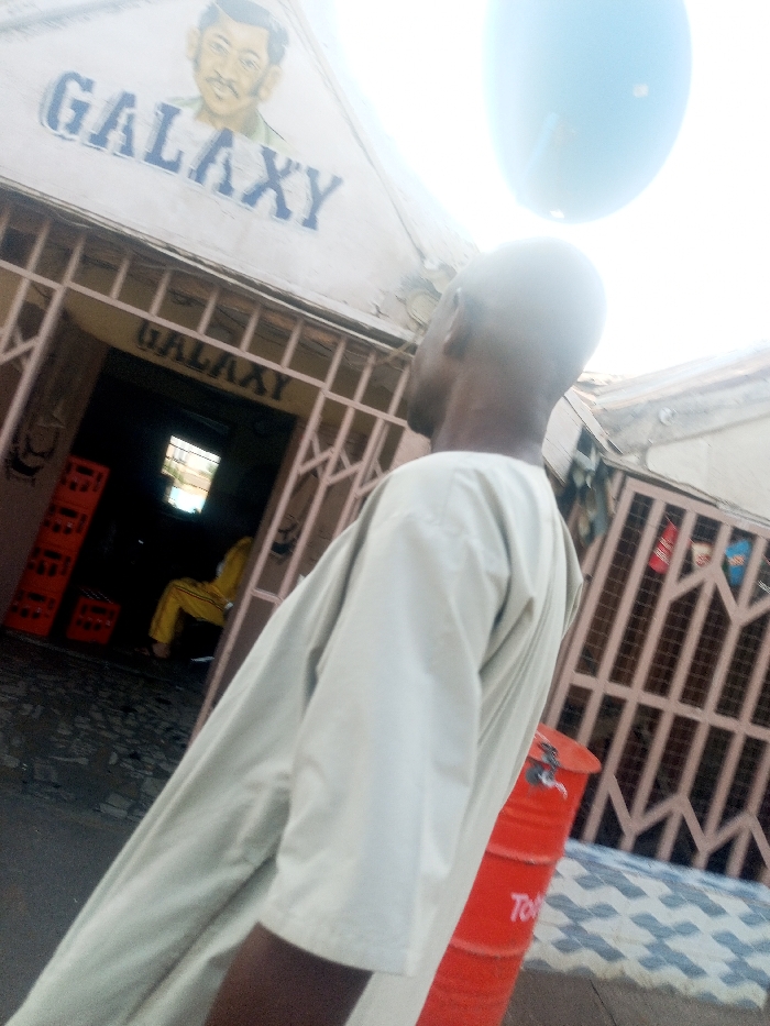 An image captures a man looking up at a building labeled "GALAXY." The building's facade includes a portrait of a man above the word "GALAXY." The man in the foreground is wearing a light-colored garment. The building has a grated entry. Inside, a person in yellow clothing is seated, and stacks of orange crates are visible. A red barrel with an indiscernible white word is positioned to the right of the man in the foreground. A blue object appears in the sky.