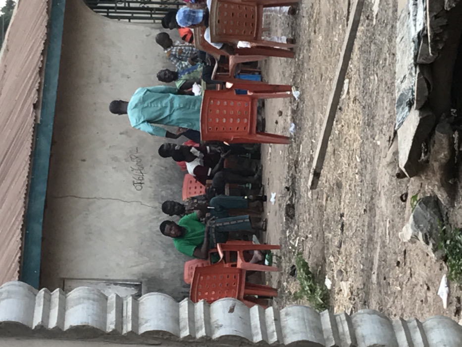 A group of men are seated in orange plastic chairs, likely outdoors. The men are dressed in casual clothing and appear to be listening to a man in a light blue shirt standing before them. A building with a corrugated roof is visible behind the group. The surrounding ground is dirt and gravel, with some debris scattered around. There is a partial view of a low wall with round columns in the foreground.