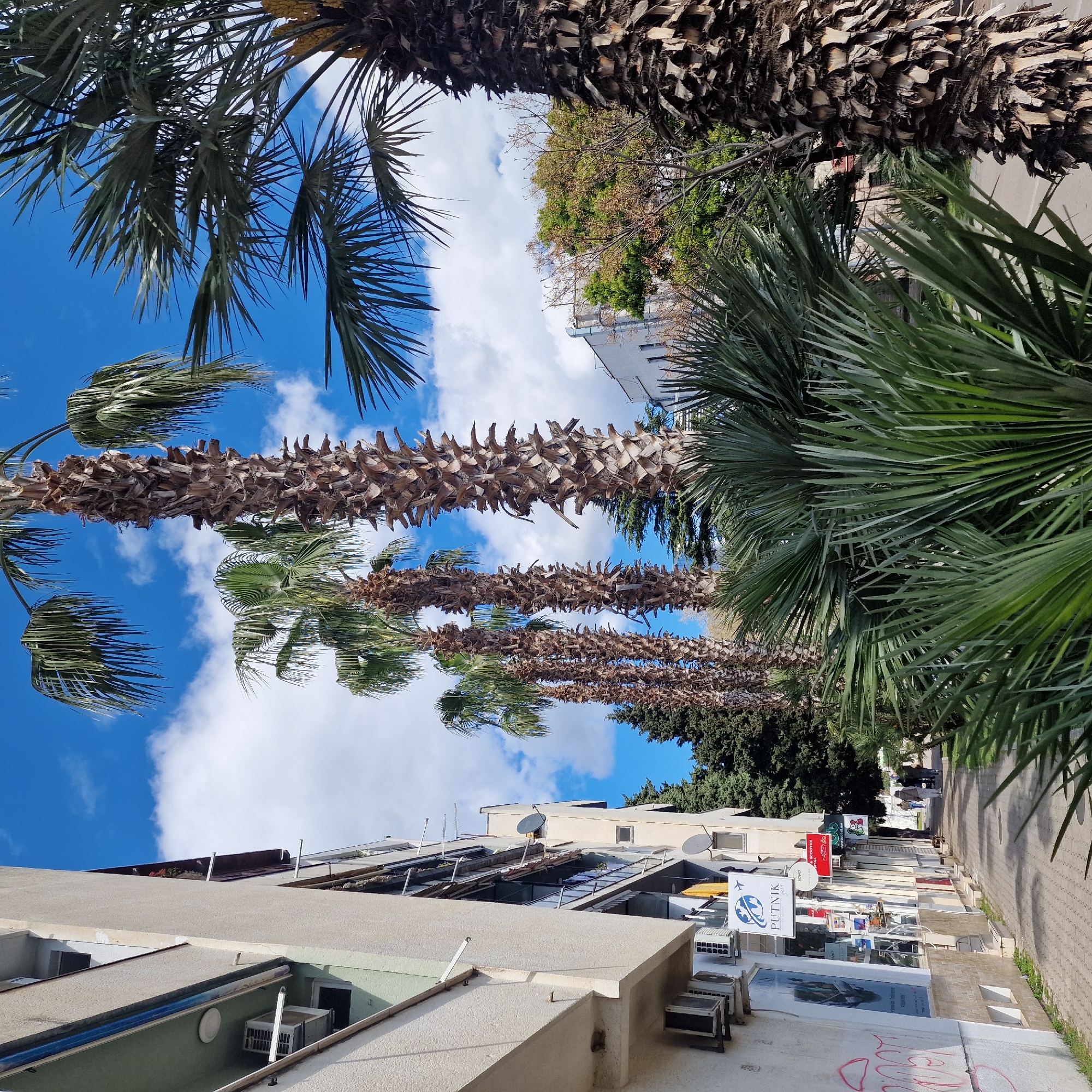 This image depicts a street in Bar, Montenegro lined with palm trees and buildings. The camera is pointed upwards, capturing the sky with clouds, palm fronds, and tree trunks. Below, buildings with flat roofs, air conditioning units, and satellite dishes are visible. Storefronts with various signs and advertisements line the sidewalk. In the distance, people walk along the paved walkway. Graffiti is visible on the lower portion of a building's exterior.