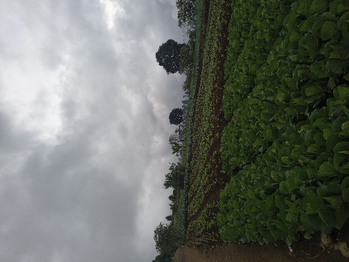This image presents an agricultural field located in An Khe Ward, Vietnam. The foreground is occupied by numerous parallel rows of mature, large-leafed green plants, consistent with cabbage, planted in dark brown soil. Beyond these, the midground features additional cultivated rows containing smaller, reddish-brown vegetation. A narrow, light brown dirt path borders the primary field along the left side of the frame. The background exhibits a scattered line of trees with dense green foliage, appearing on a slightly elevated terrain. The sky is heavily overcast with uniform grey clouds, suggesting diffused light or impending precipitation. No individuals or discernible actions are present in the scene.