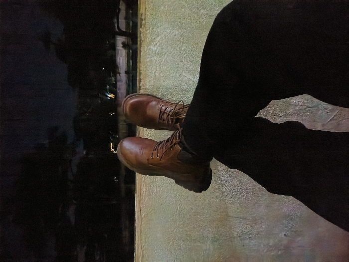 - "A person wearing brown leather boots is seated on a ledge, their legs dangling over the edge" by FM-X3Isl2, licensed under CC BY 4.0