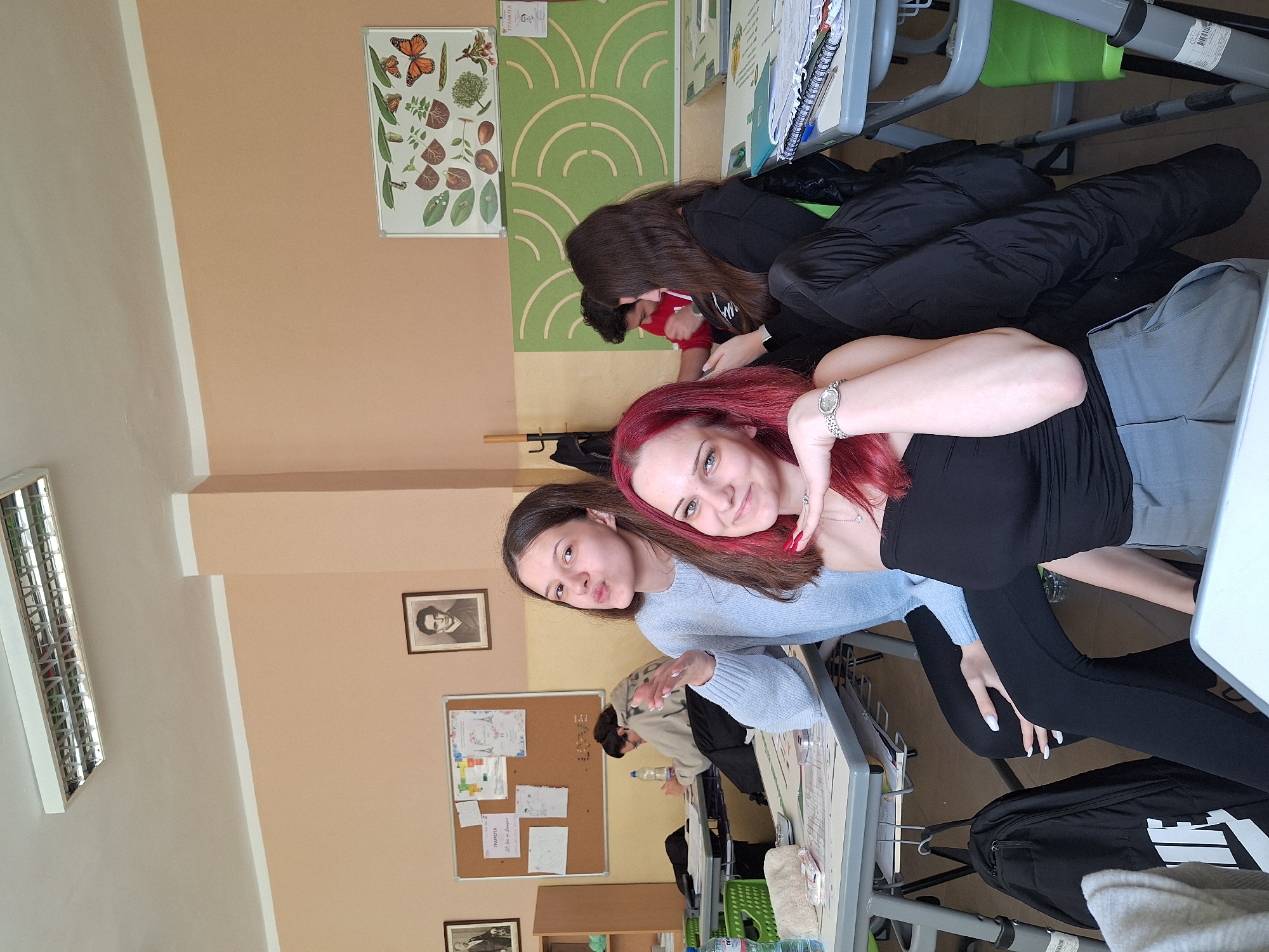 The image depicts a classroom in Kozloduy, Bulgaria. In the immediate foreground, two young females are positioned towards the camera. The female on the left has long brown hair, wears a light blue sweater and dark leggings, and is seen pouting with her right hand extended. The female on the right has red hair, wears a black strapless top and grey pants, and is smiling with her right hand resting on her chin, displaying a silver watch and red nail polish. A black backpack with a "NIKE" logo hangs from a desk near the left subject. The classroom environment includes multiple grey student desks and chairs. In the midground, a green water bottle, notebooks, and pens are visible on desks. Several other students are present in the background. To the far left, a student in a light-colored hooded sweatshirt is seated, looking down at their desk. To the right, another student with long dark hair, wearing a black top, is looking at a mobile phone. A third student in a red shirt is partially visible behind her, also appearing to engage with a phone. The walls are pale peach with white crown molding. On the left wall, a cork board displays various papers, including a "ГРАМОТА" (diploma) and a decorative image of the Eiffel Tower. Two framed portraits of historical figures are mounted above the cork board, one prominently depicting Hristo Botev. On the right wall, a whiteboard features a botanical diagram illustrating leaves, seeds, and monarch butterflies. Below it, a large green decorative panel with a curved, maze-like pattern is affixed. The ceiling is white with a rectangular fluorescent light fixture.