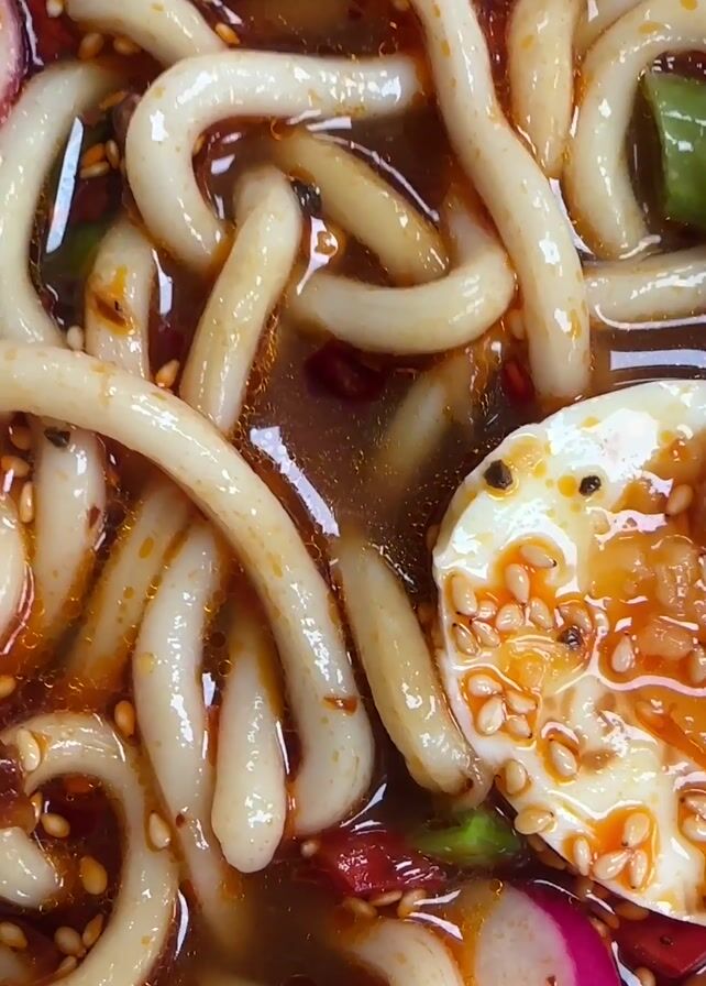 The camera provides a close-up view of a bowl of noodle soup. The noodles are thick and white, coated in a glossy, reddish-brown sauce that appears to be spicy. Among the noodles are chopped green and red vegetables, as well as slices of pink radish. A halved egg with a bright orange yolk is also visible, sprinkled with sesame seeds. The overall scene suggests a flavorful and visually appealing dish.