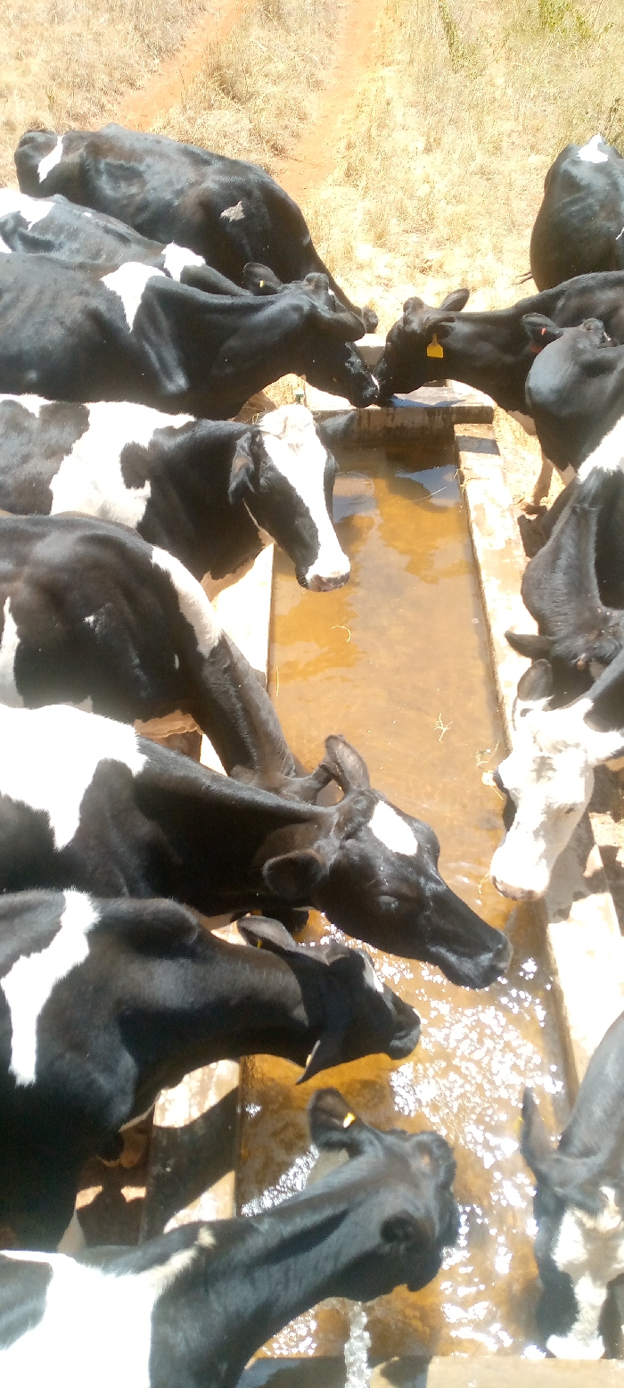 Cows with black and white markings crowd around a long trough filled with murky water. Most of the animals have their heads lowered, drinking. Some have tags on their ears. The trough appears to be made of concrete. Beyond the cows is a dry, grassy field. The sunlight is bright, creating strong shadows.