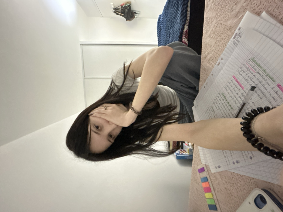 A young woman with long black hair is seated at a desk, covering her mouth with her hand. Papers with handwritten notes in French are scattered on the desk, along with a pen, colorful sticky notes, and a phone. The notes appear to be school-related. She is wearing a light-colored shirt and jeans. A bracelet is visible on her wrist. The background includes a sliding door closet and a bed with a blue blanket.