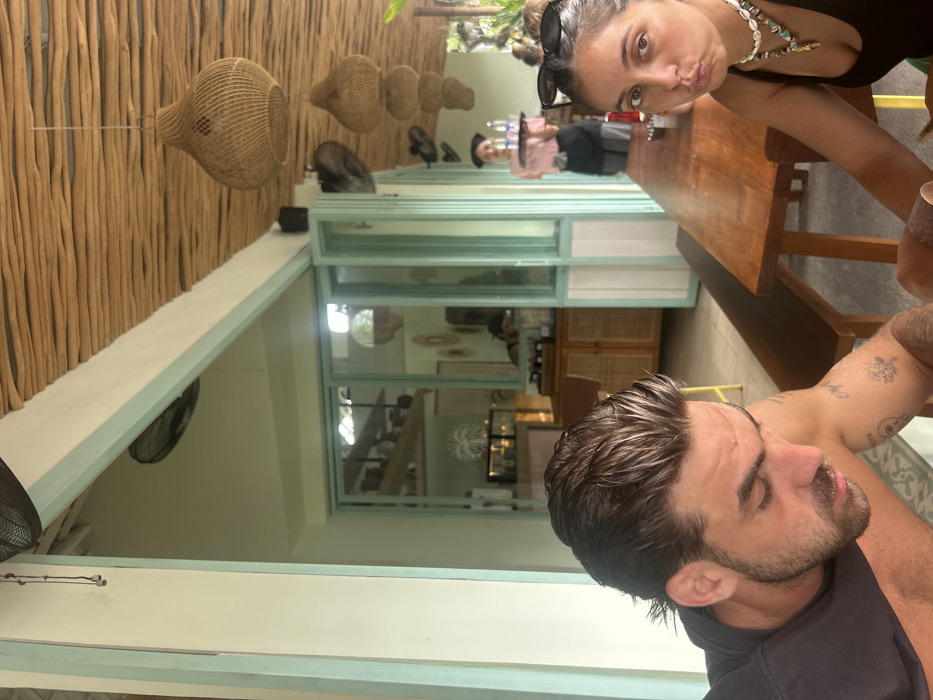 This image depicts a casual dining establishment in Canggu, Indonesia, featuring three individuals and an open-plan interior