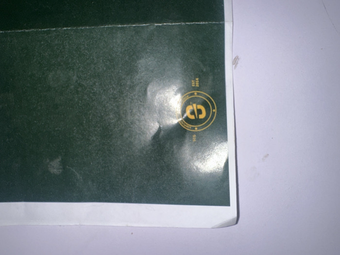 A close-up captures the corner of a document, revealing its thick, white border against a textured, deep green background. The paper shows a slight crease and sheen from the light. A gold logo, encircled and featuring the letters 'CD' and 'Established 2014', is subtly placed near the edge. The document rests upon a clean, bright white surface, contrasting sharply with the dark green.