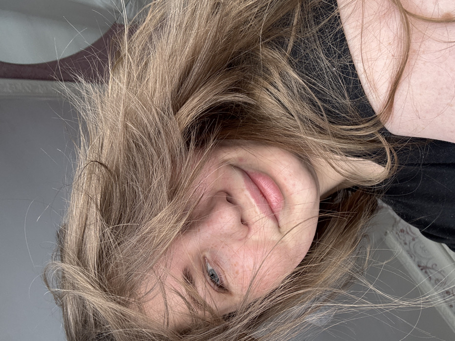 A close-up, frontal portrait features a young individual, likely female, situated indoors in the city of Уральское, Russia. The subject possesses light brown to blonde hair, which appears disheveled and covers a significant portion of the upper face and extends across the frame. Visible features include blue eyes, fair skin with distinct freckles across the nose and cheeks, and a slight, closed-lip smile. A dark, likely black, garment is visible on the subject's lower right shoulder and arm. The background is a blurred, light gray hue, with faint structural details suggesting an indoor setting; a patterned or textured element is discernable on the far left, and a dark, curved object is partially visible on the upper right.