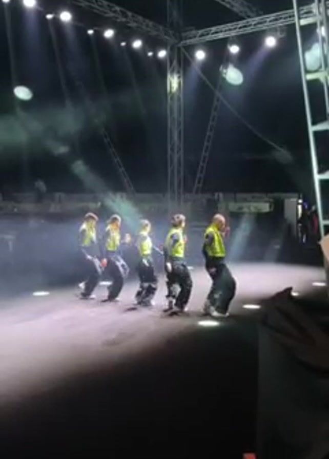 Five people wearing neon yellow vests and dark pants are performing a synchronized dance routine on a black stage under bright spotlights. The stage is part of a larger setup with metal scaffolding, creating a structured atmosphere. A crowd can be seen in the background.
