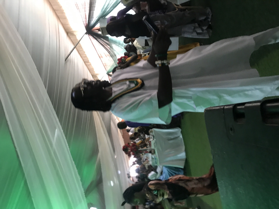 Within an event space in the city of Nabatum, Nigeria, an indoor gathering is underway beneath a draped ceiling featuring white fabric illuminated by green light, with additional darker drapes visible