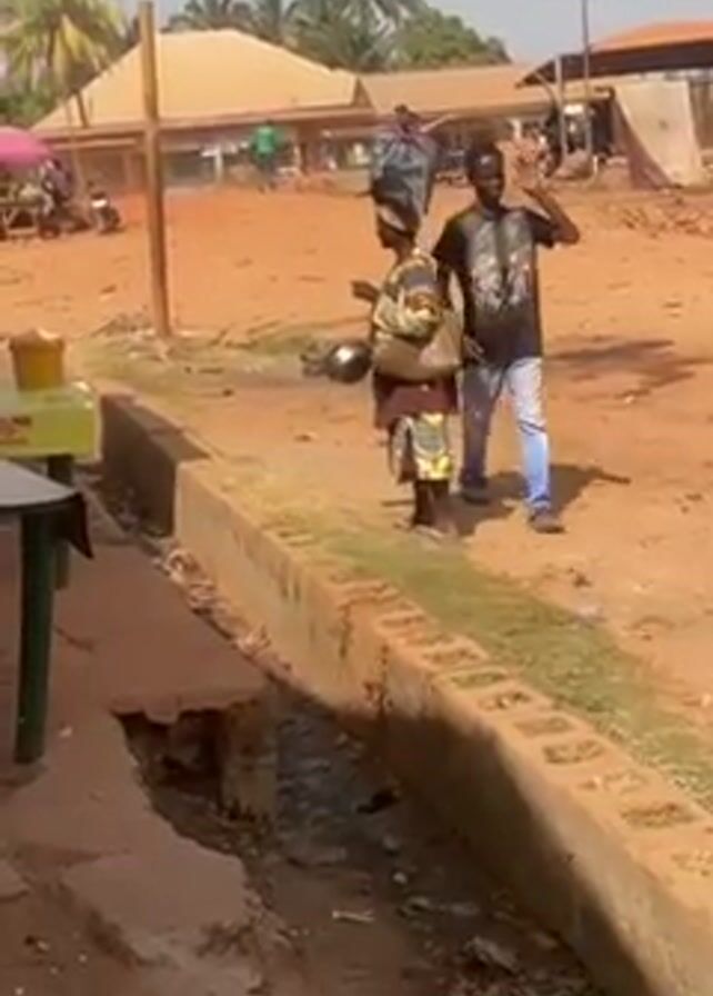 daytime scene in an outdoor area, likely a market or village square, with a red dirt ground. In the foreground, there is a concrete drainage ditch and a table. An adult woman is standing near the ditch, carrying a bag on her head and a metal pan in her hand. A young man walks behind her, seemingly talking on the phone. In the background, other people can be seen moving around, and there are buildings, trees, and a motorcycle. The lighting is bright and sunny.