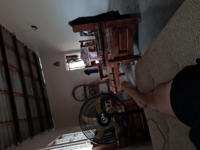 The image displays an indoor scene, specified as being in La Guardia, Venezuela. The perspective is low, looking across a room from a reclining position. In the foreground, the lower portion of a person's bare right leg and foot is visible, resting on a light-colored, patterned mattress or cushion. The individual wears dark shorts. A black standing electric fan with an "LM" logo on its central hub is positioned to the left, partially obscuring a window with vertical bars. An electrical cord extends across the foreground towards the fan. In the midground, a tall, light brown wicker shelving unit holds various small, indistinct objects. To its right, a dark wooden dining table and several chairs with carved backs are arranged; some chairs have dark clothing draped over them. A rectangular opening in the distant wall, appearing to be a doorway or large window, shows additional clothing hanging within and allows natural light to enter. The walls are light-colored. The ceiling consists of exposed dark wooden beams supporting corrugated panels, indicating an unfinished or practical roof structure. A small, dark, decorative element is mounted on the far wall above the wooden furniture, and a small crescent-shaped object is on the upper right wall. The floor beneath the furniture is tiled with grey squares.