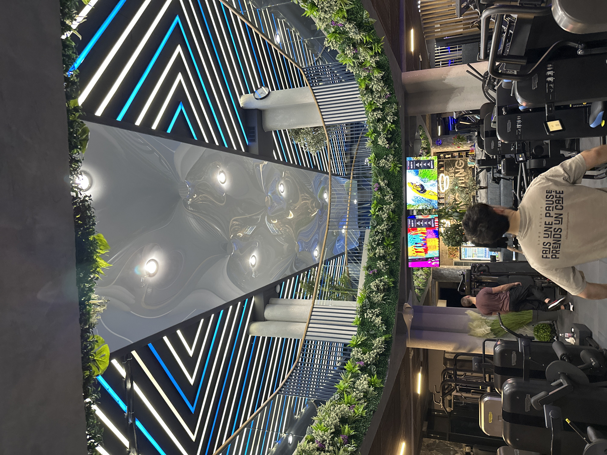 A modern gym interior features a striking architectural design. A curved staircase with blue and white linear lighting ascends around a central structure adorned with greenery. The ceiling boasts a glossy, fluid-like pattern with recessed lighting. Exercise equipment is visible, with individuals working out. Screens display vibrant images. The scene combines natural elements with modern design for a unique fitness environment.