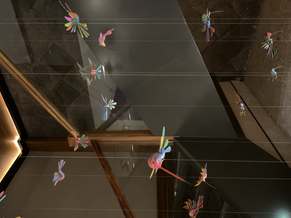 A view looking up at a display of colorful, stylized birds suspended by thin wires from a ceiling. The birds have bright, iridescent wings and elongated beaks. The ceiling is constructed with a mix of dark gray and wooden beams. The lighting is dim, creating shadows and reflections on the ceiling surfaces.