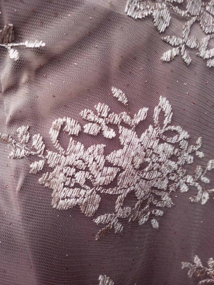 - "Floral embroidery embellishes a mauve tulle fabric" by FM-hIHDu1, licensed under CC BY 4.0