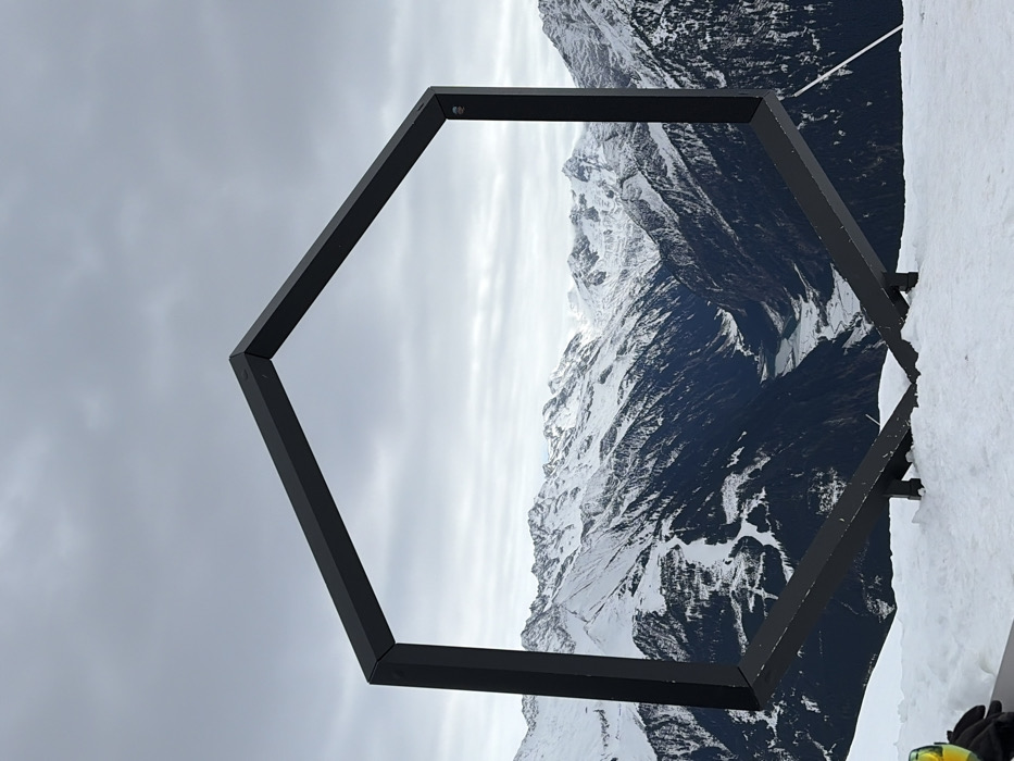 The image depicts a static, wide-angle view from a snow-covered mountain peak near Finkenberg, Austria, under an overcast sky. A large, dark-colored hexagonal metal frame is centrally positioned in the foreground, erected in fresh white snow. The frame's lower two sections are anchored into the snow, and a portion of a yellow/green ski glove and ski/snowboard edge are visible in the lower-left corner. The hexagonal frame perfectly encloses a panoramic vista of the surrounding Austrian Alps. Through the frame, a deep mountain valley is visible, flanked by numerous snow-covered peaks and slopes partially covered with dark evergreen trees. A body of water, possibly a partially frozen lake or river, is discernible at the base of the distant valley. Ski trails are apparent as cleared white lines on some mountain slopes. The sky above is uniformly grey with dense cloud cover. There are no individuals explicitly visible within the frame.