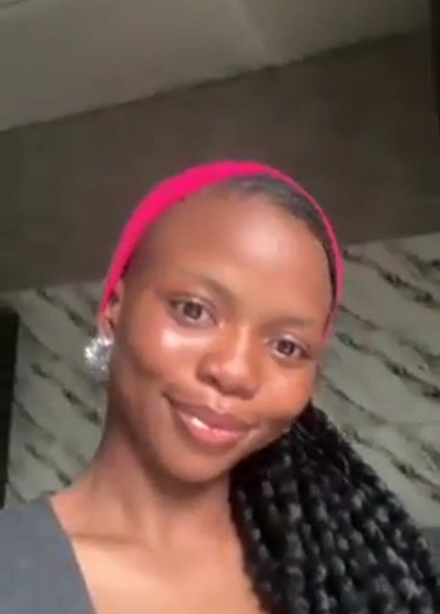 A young woman with dark skin, wearing a gray shirt and a pink headband, is facing the camera. Her hair is styled in long braids. She has small, sparkly earrings. The background is a wall with a gray and white marble-like pattern. She smiles slightly and runs a hand through her hair briefly.