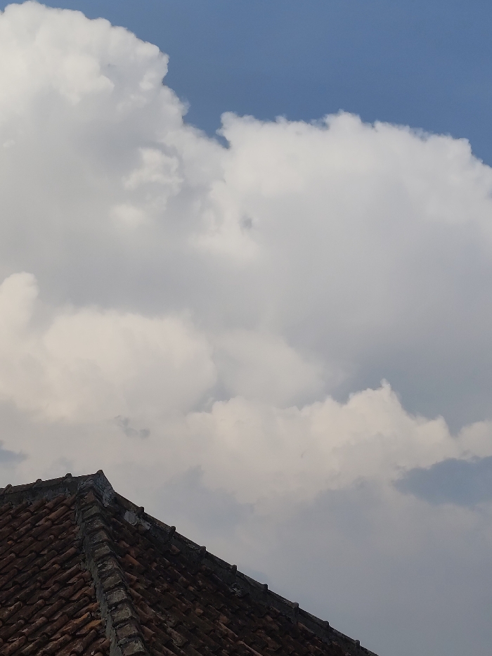 - "The image displays an upward-angled view of a tiled roofline against a sky filled with cumulus clouds, located in the city of Unknown, Unknown" by FM-cWnto2, licensed under CC BY 4.0
