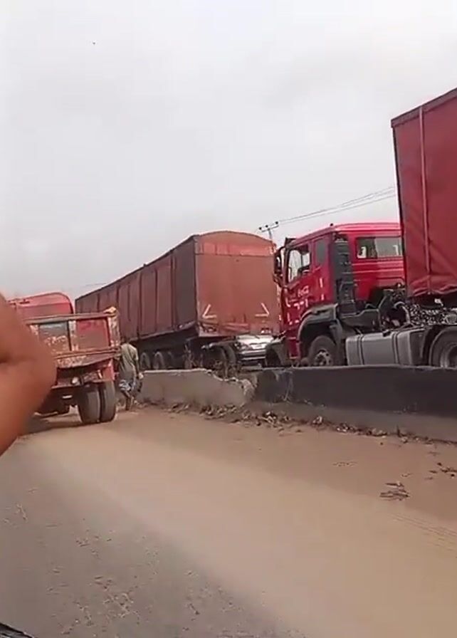 several large trucks on a road with barriers. Other vehicles, including a silver car and a smaller truck with a colorful body, are also visible. A person's arm appears in the foreground of the video. The environment appears to be somewhat dusty or sandy, and the sky is overcast.