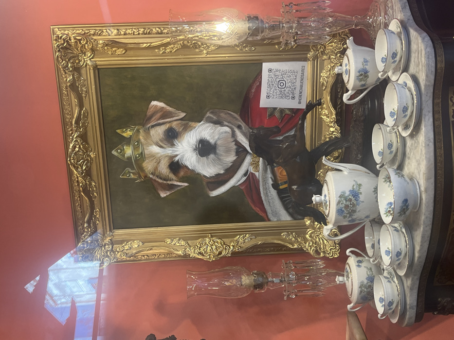 An interior scene in Buenos Aires, Argentina, specifically at a location identified as "Herencia Buenos Aires" via a QR code displayed on an artwork. The primary subject is a vertical portrait painting encased in a gilded, ornate frame. The painting depicts an anthropomorphized terrier dog, likely a Jack Russell, wearing a golden crown and a royal red robe with white fur trim. A dark brown horse figurine stands on the table in front of the painting, partially obscuring its lower section. A white square containing a black QR code and the text "@HERENCIABUENOSAIRES" is affixed to the lower right area of the painting, overlaying the dog's robe and the horse figurine. The artwork rests on an antique-style console table featuring a light-colored marble top with dark veining and a dark, ornate base. Arranged on this table is a white porcelain tea set adorned with blue floral patterns and gold accents. The set includes one large teapot, one smaller creamer or second teapot, one sugar bowl, and at least eight teacups with matching saucers, plus one additional larger bowl. Flanking the painting are two tall, ornate crystal table lamps or candelabras, each with a hurricane-style glass shade and hanging crystal prisms; the lamp on the right is illuminated. The background wall is uniformly painted in a vibrant coral or reddish-orange hue, with a prominent light reflection in the upper left corner. No individuals are present in the scene.