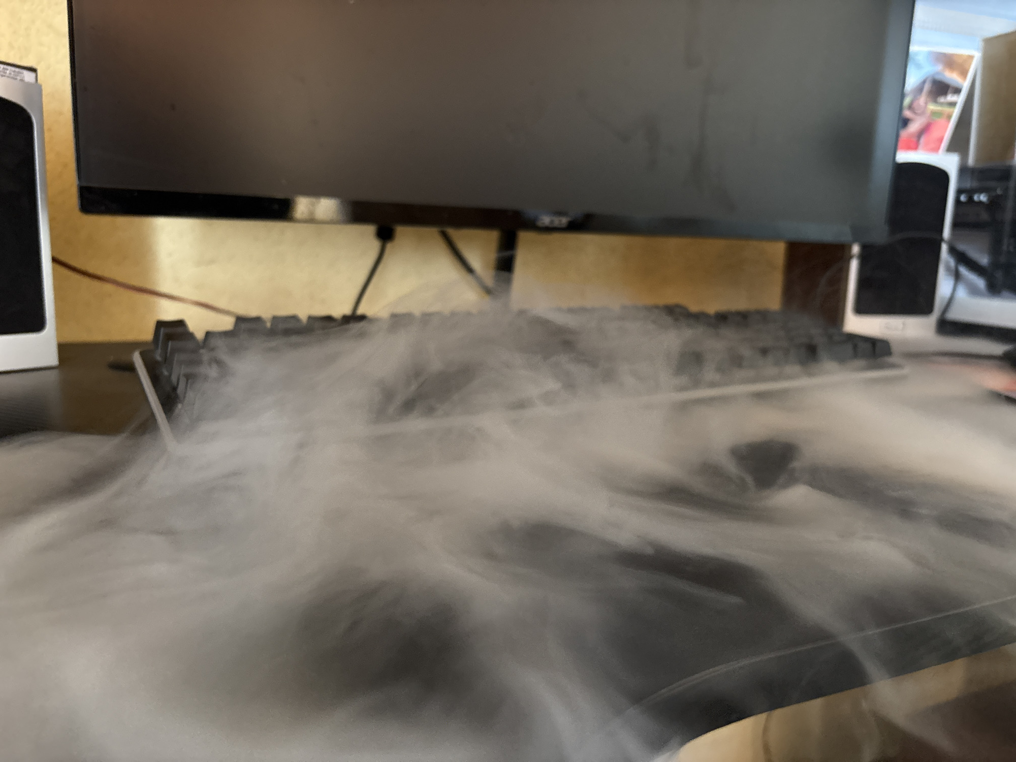computer setup consisting of a monitor, keyboard, and speakers, with smoke or vapor obscuring much of the view