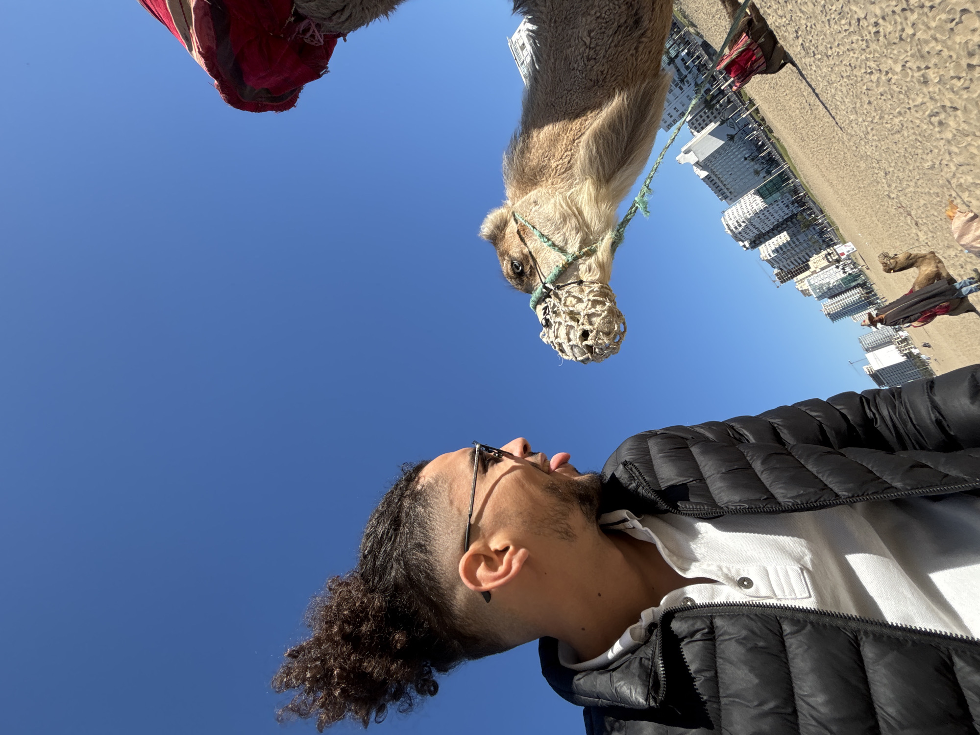 A man is seen from a low angle, looking up at a camel with a muzzle in Tanger, Morocco. The man is wearing glasses and a black puffer jacket. The camel has a red blanket on its back. Buildings are visible in the background. The sky is clear and blue. The photo appears to be taken on a beach.