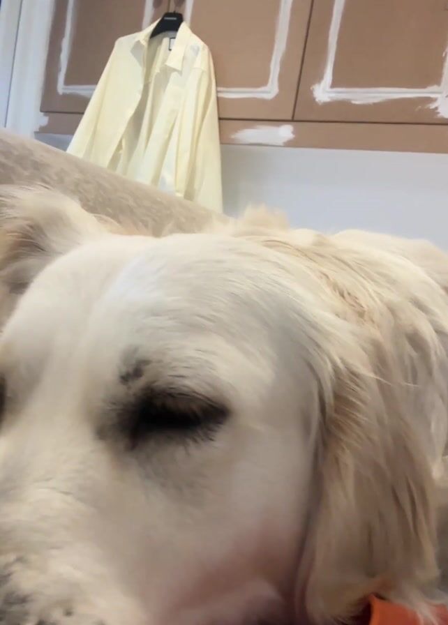 A close-up video shows a golden retriever lying on a white blanket