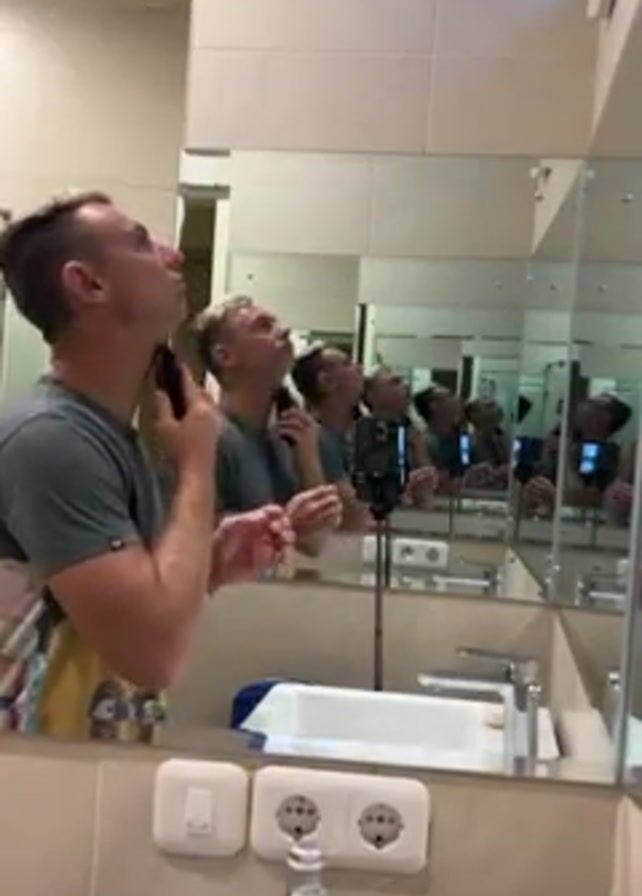 A man is shaving in a bathroom. He’s wearing a grey T-shirt and facing a large mirror with a selfie stick and phone attached in front of it. The mirror shows multiple reflections of him. He’s holding a black electric shaver to his neck, moving it upwards. The bathroom has a white tiled wall, a white sink, a double electrical outlet, and a bottle of water.