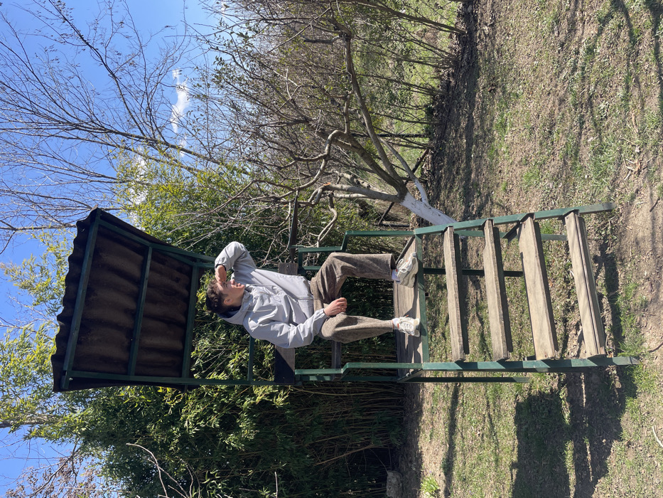 - "A young male individual, dressed in a light gray hooded windbreaker, brown patterned trousers, and white sneakers, sits on the elevated platform of a green metal observation stand" by FM-K8mpv1, licensed under CC BY 4.0