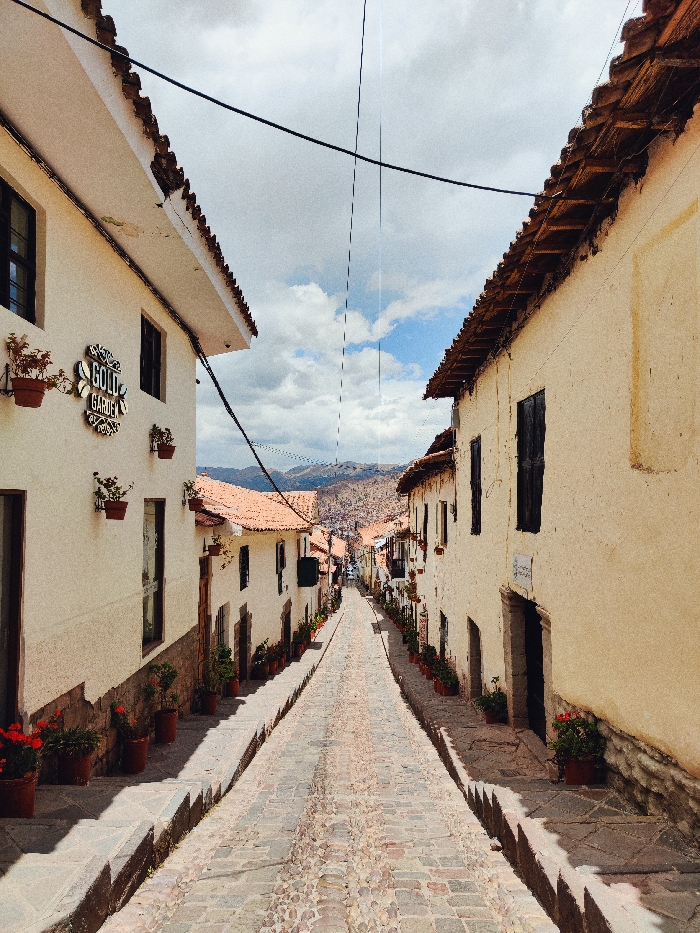 The image depicts a narrow, inclined cobblestone street in Wanchaq, Peru, flanked by two-story buildings with light-colored facades and terracotta tile roofs