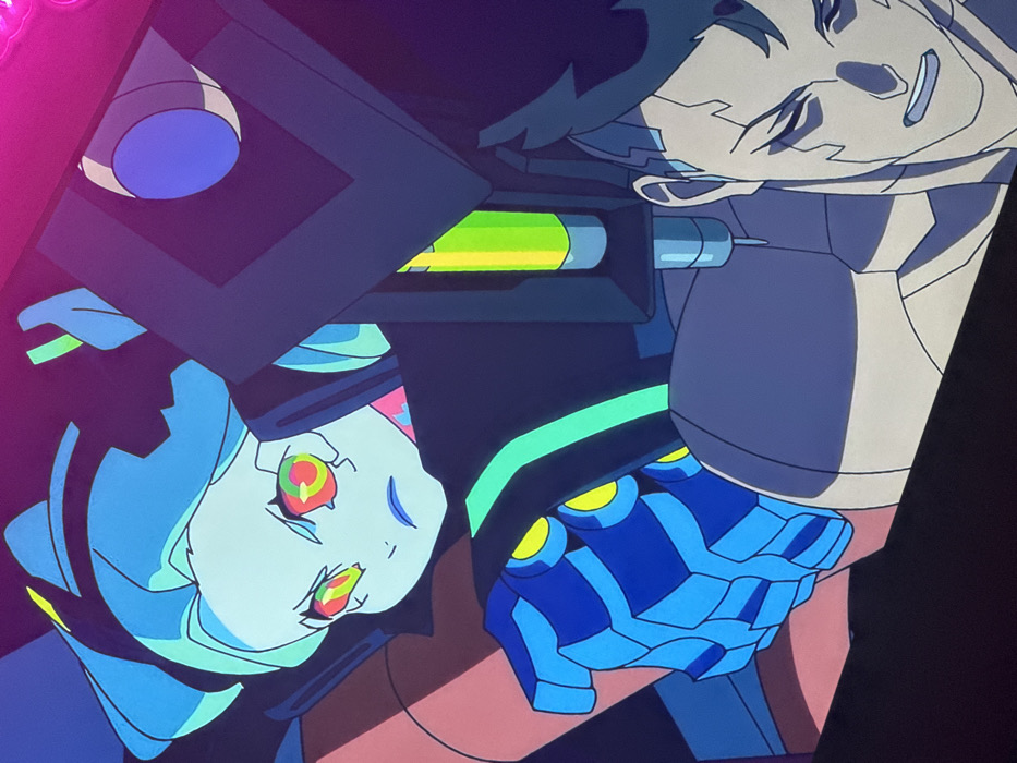 The image displays an animated scene featuring two characters within a dark, undefined environment. No specific real-world geographic location, such as Rostov-on-Don, is discernible. In the upper-left section, a female character is prominent, characterized by light blue, angular hair and notably pale skin. Her eyes feature large, multi-colored irises composed of concentric red, yellow, and green rings, surrounded by red, crack-like patterns. Her expression is serious, with a subtle frown. She wears dark attire accented by a distinct bright cyan-green horizontal stripe across her chest/shoulder area. Her visible left arm is equipped with a complex, segmented blue prosthetic hand or gauntlet, detailed with yellow circular components. This hand appears clenched or gripping an unseen object. Partially visible in the lower-right section is a male character, depicted from the chest upwards. His skin is a light grey tone, marked with dark, angular patterns on his face and ear, suggesting cybernetic augmentation. He has short, dark hair. His facial expression indicates strain or determination, with his mouth slightly open. He wears a dark, possibly armored, shoulder component. This component houses a vertical, glowing neon-green cylindrical object, which appears to be a power source or chemical reservoir. A thin, needle-like connector extends from this glowing cylinder, apparently inserting into his shoulder or neck area. The background is dark and indistinct, with an out-of-focus magenta light source visible in the upper-right corner. The scene exhibits a futuristic or cyberpunk aesthetic, suggesting a moment of tension or active engagement.