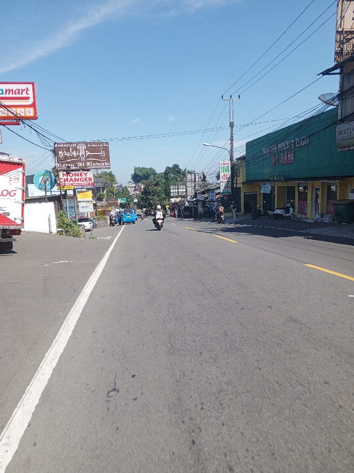 The image displays a daytime street scene in Multhan, India, under a clear blue sky with minimal cloud cover. The view is from a paved asphalt road looking forward. On the left side of the road, an asphalt shoulder is delineated by a solid white line. A partial red and white vehicle is visible in the foreground. Further along, multiple commercial signs are present, including a red sign with "mart", a white sign with "F17 LOG" and "MONEY CHANGER", and a large brown sign featuring Arabic script above "RESTAURANT". A blue car is located on the left side of the road, and a person on a white and black motorcycle, wearing a white helmet, is observed riding away from the camera in the left lane. Buildings and trees extend into the background on this side. The right side of the road features two solid yellow lane markings. A utility pole with a streetlamp and a dense network of overhead power lines is positioned mid-frame. Adjacent to the road is a two-story building, primarily teal/green with yellow accents on the ground floor, displaying a sign that reads "MAJUN DOKTER TUGU". Several scooters and motorcycles are parked on the sidewalk in front of this building. Two to three individuals are standing or walking on the sidewalk. Another motorcycle with a rider is visible further down the road on the right. The road surface is dry and appears to be in fair condition. The scene indicates an active urban environment with commercial activity.