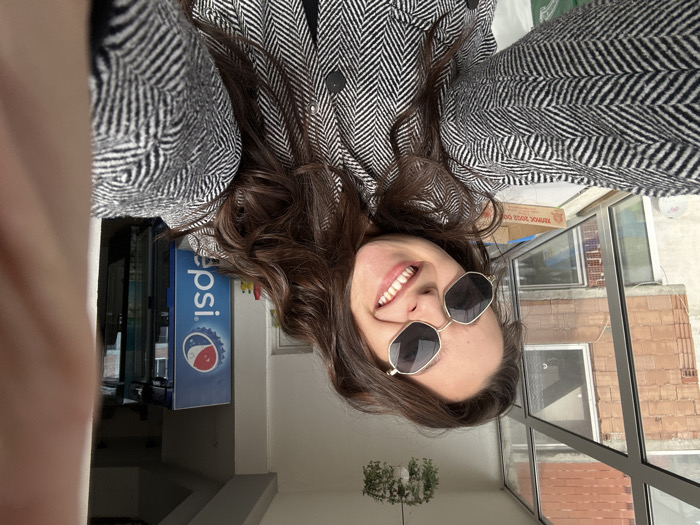 A female individual is depicted in a close-up selfie, smiling widely at the camera while wearing dark, polygonal-framed sunglasses