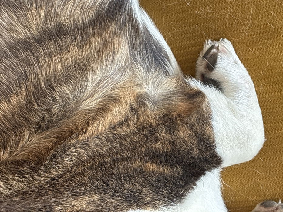 A close-up view depicts a domestic dog resting on a mustard yellow, textured fabric surface. The animal's fur exhibits a brindle pattern, characterized by streaks of dark brown, light brown, and tan, interspersed with areas of white fur, particularly evident on the lower body and a bent leg. A paw, featuring dark claws, is visible at the lower right. The scene is located in Tbilisi, Georgia.
