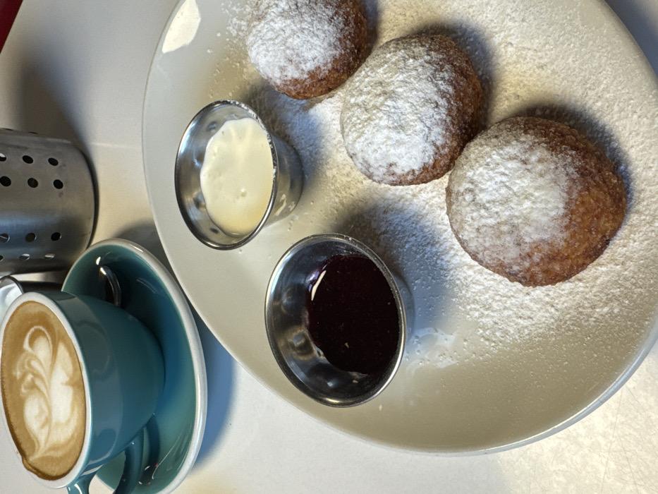 A teal ceramic cup containing a latte with a leaf-patterned foam design rests on a matching saucer with a silver spoon to the upper left. Behind it, a silver, perforated metal utensil holder is partially visible. To the right, on a white, irregularly shaped plate, are three round, fried pastries heavily dusted with powdered sugar. The plate also holds two small, silver metal ramekins; one contains a white, creamy substance, and the other holds a dark red preserve. Powdered sugar is scattered across the plate surface. The scene is set on a white tabletop, likely in a cafe or restaurant in Mahilyow, Belarus. No individuals are present.