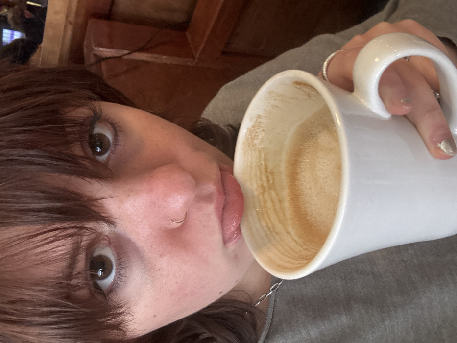 A woman with brown hair and bangs tilts her head, holding a large white mug of coffee. The mug is nearly empty, with coffee remnants visible on the inside. The woman has a nose ring and several rings on her fingers. She's wearing a gray top. A wooden object is visible in the background. The overall impression is casual and intimate.