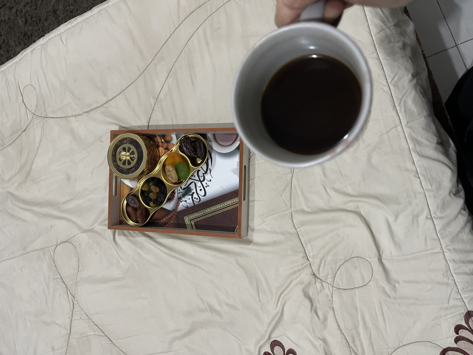 A beige comforter with curved stitching patterns covers a bed. A tray holding nuts, dates, and a container sits atop the comforter. A coffee mug filled with dark liquid is held in the air near the tray.