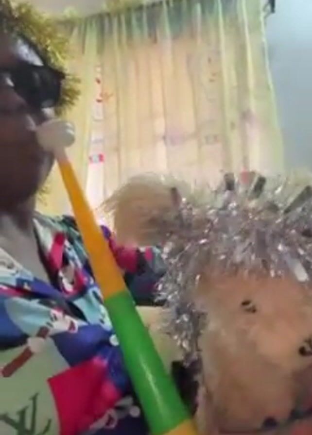 person with dark hair wearing sunglasses, a gold tinsel garland in their hair, and a patterned pajama-style top. They are blowing into a yellow and green party horn. In their arms is a teddy bear with silver tinsel wrapped around it. The background includes a yellow curtain with printed designs and a metal curtain rod. The overall scene appears festive and celebratory.